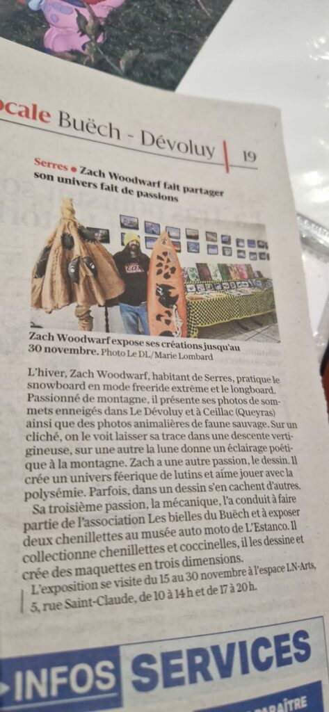 L’artiste graphiste Zach vous propose des photographies de montagnes (Dévoluy, Ecrins…), animalière et sportive (grâce à la pratique du snowboard, freeride), des T-shirts stylisés dans le thème de la féérie, des peintures, des objets 3D (chenillettes du musée Estanco à Serres, voitures Coccinelles et Combi)…